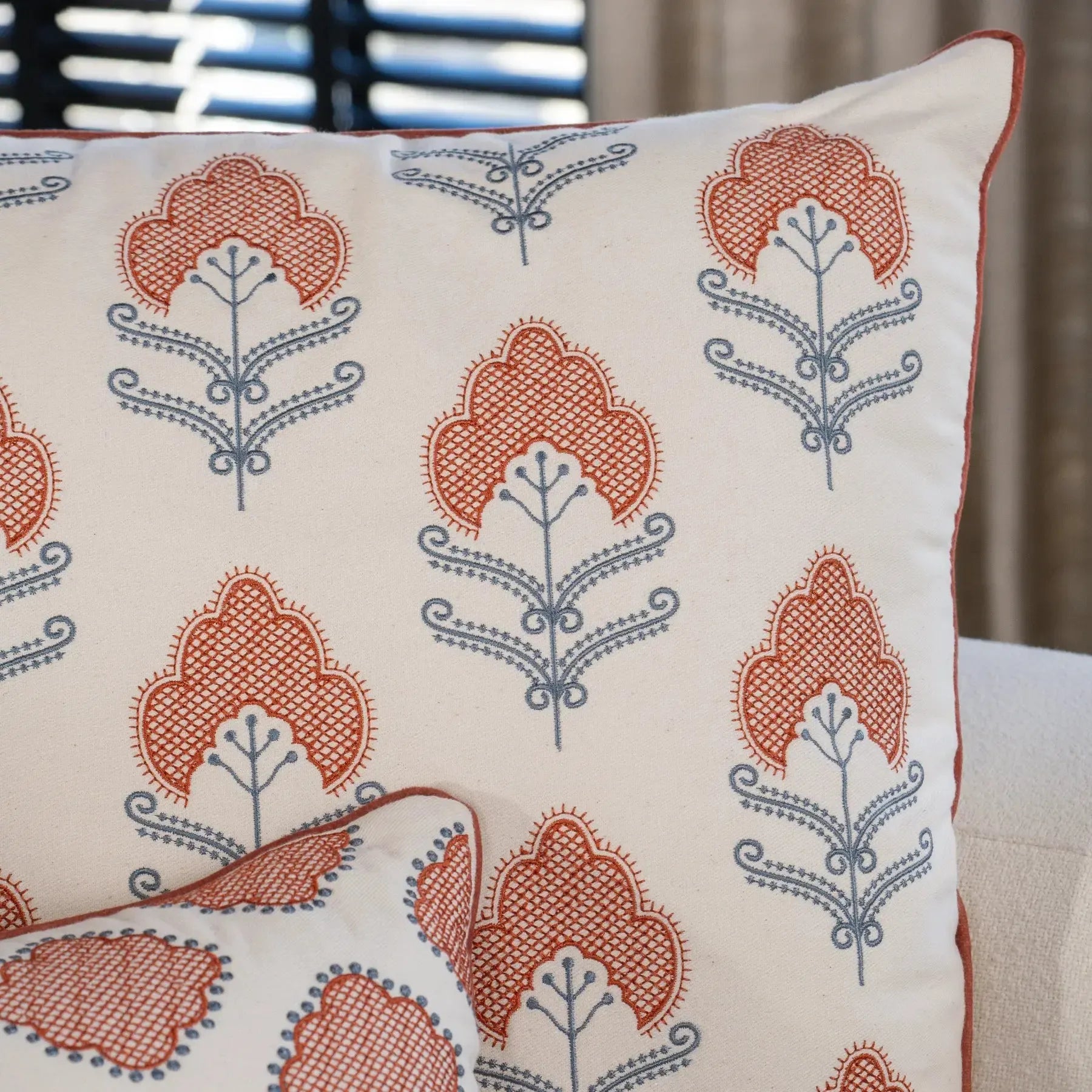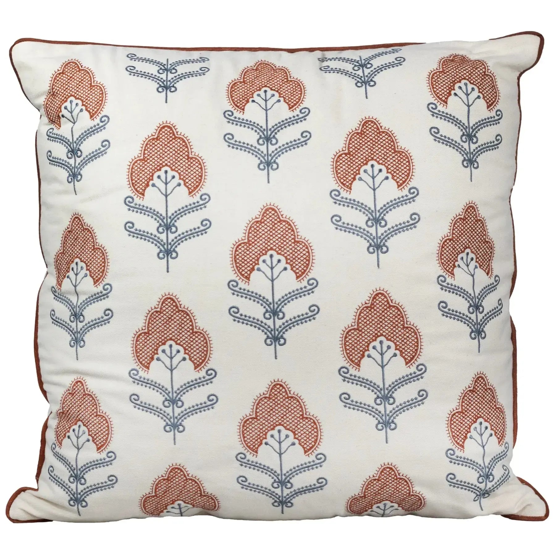 Almofada Sarja Cru 52x52 Bordado Terracota Fino Indiano Rajah